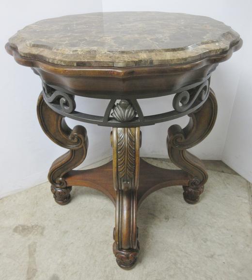 The marble top rests on a finely sculpted walnut base.